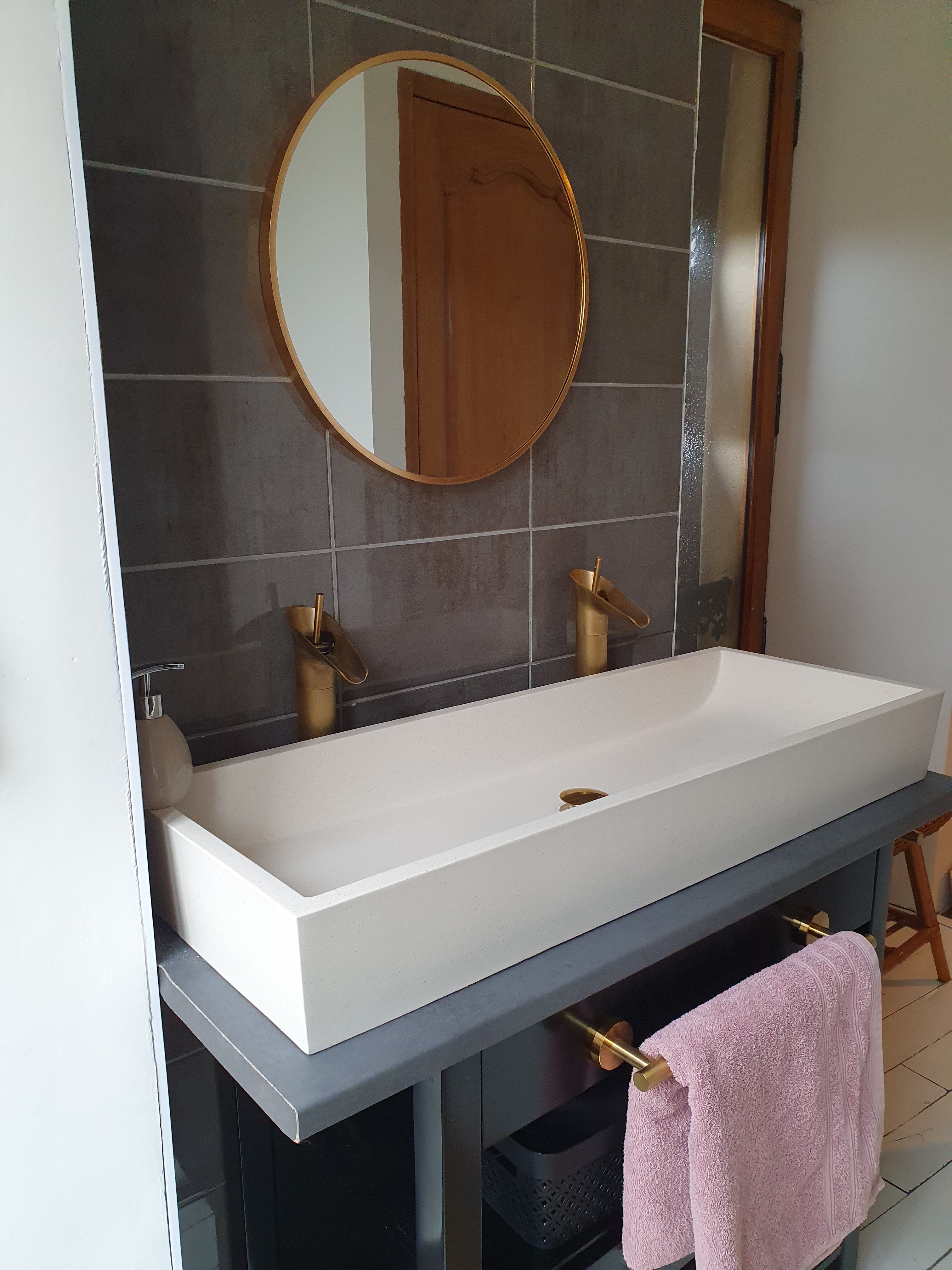 Une chambre pour 2 à 4 personnes, située au 1er étage. Propose 1 lit double (160 cm) et 1 à 2 lits simples (80 cm), avec une salle d’eau privée comprenant douche, double vasque et WC.